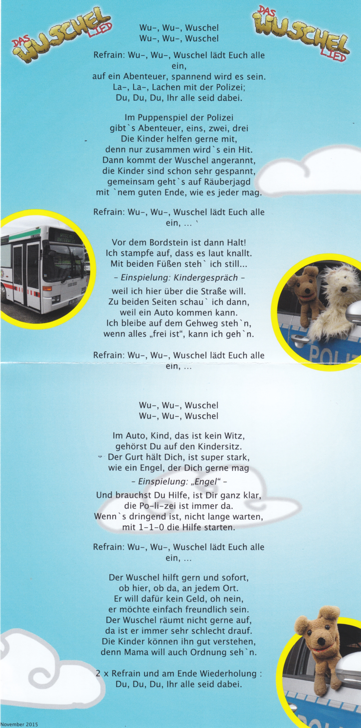Als Thomas Glaser (er macht seit Jahren die Verkehrserziehumg mit Kindergartenkindern im Polizeibus) anfragte, ob ich ihm helfen könnte, das Wuschellied für eine CD-Aufnahme etwas aufzumotzen, kam ich dieser Bitte sehr gerne nach.